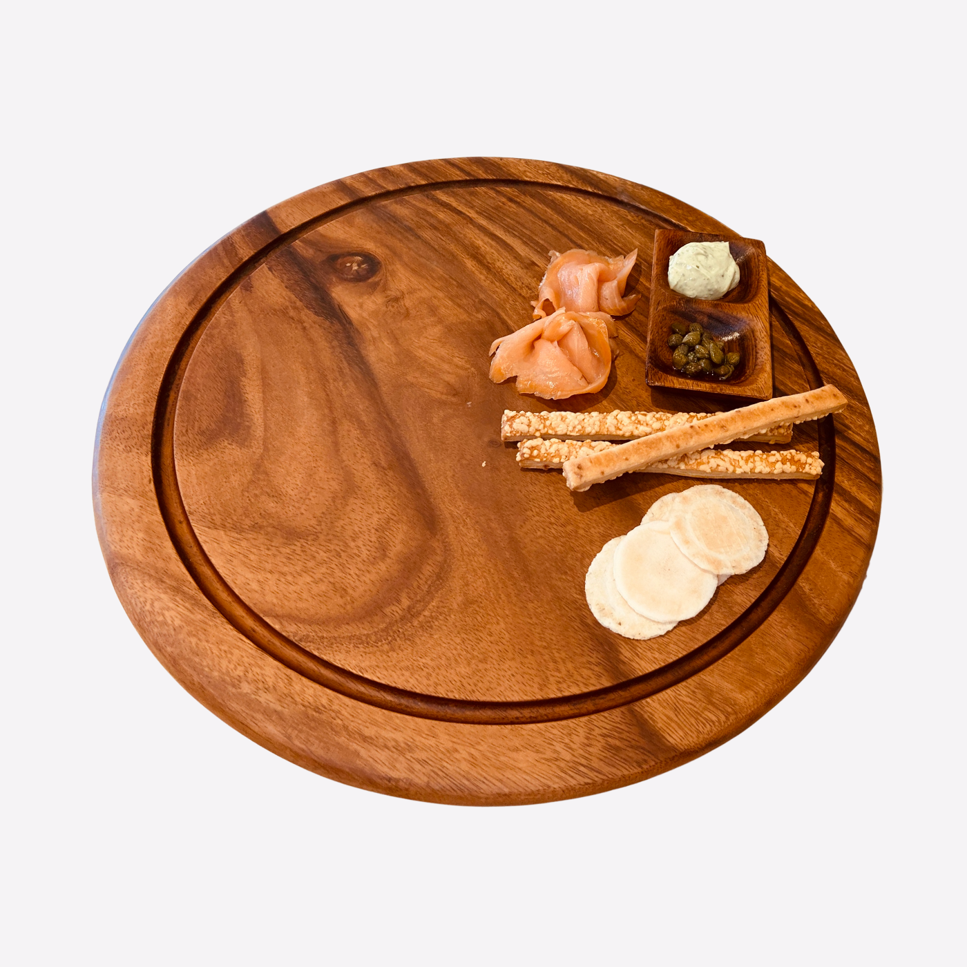 A premium acacia wood round board with a juice groove, designed for serving and carving. Ideal for bread, cheese, grazing and shared platters with a clean, practical finish.